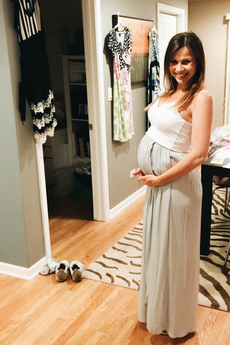 I took the same blue skirt and wore it with a different top for my maternity shoot at 36 weeks. I was much bigger at this time and very swollen during this shoot. But the skirt worked perfectly. I also wore this skirt to a wedding at 38 weeks and then continues to wear it after my pregnancy.