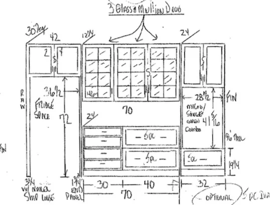 Below is a sketch of what our kitchen design looks like. This is just one of two wall of perimeter cabinets that we will have. We opted for glass doors on three of the uppers, along with one drawer bank to the right of the fridge. For larger pots and pans, we have the two extra large drawers to the left of the microwave/oven combo.