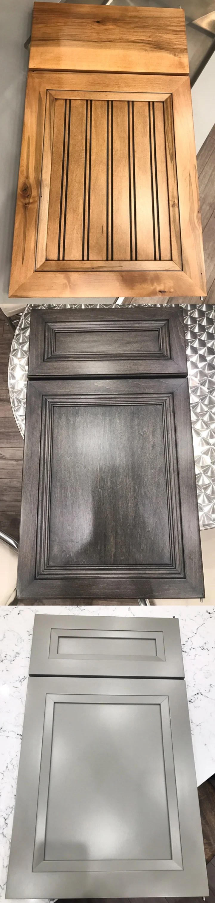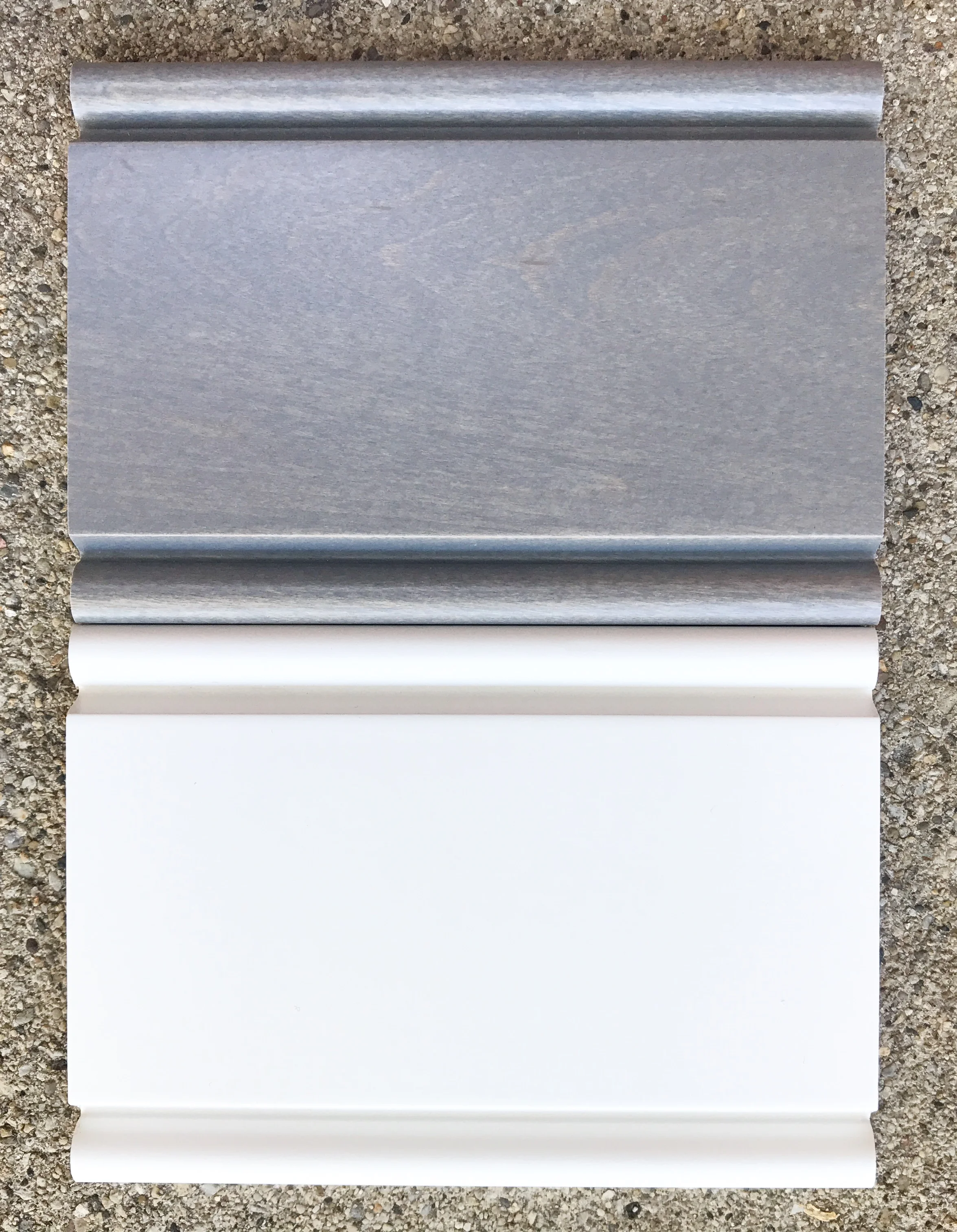 The top color is a light gray stain that we opted for in our master bath. The color pallette in the master is going to be grays and whites, so we are thinking this would look great in the space. The white is the same decora white that will be used in the kitchen, and this is for the main bath for the kids.